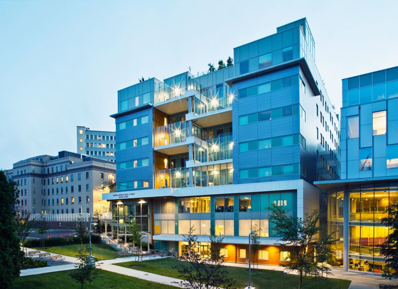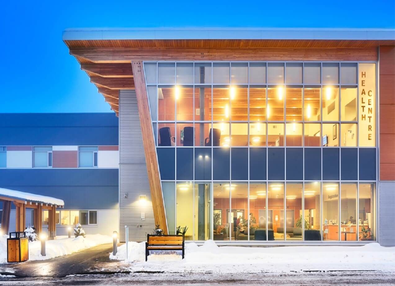 A large building with a lot of windows and the word healthy on it